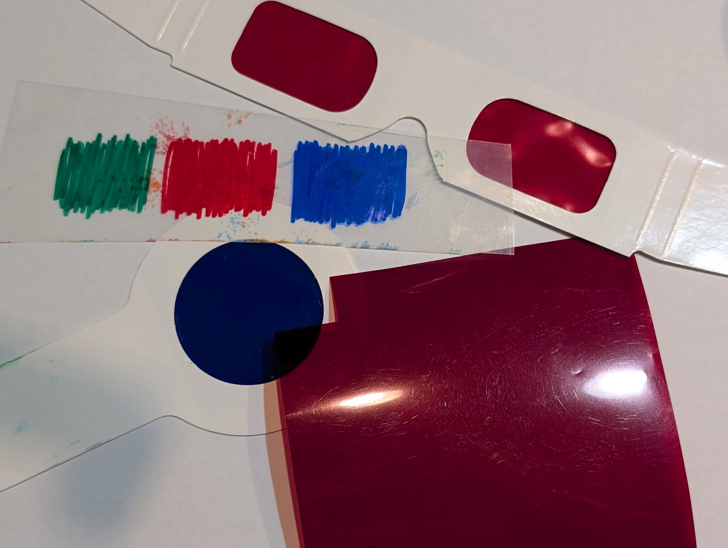 Depending on our resources, we could have proper 3D glasses, some random color filters purchased online, or even make a filter by rubbing a Sharpie marker on some transparent film. Results will vary.